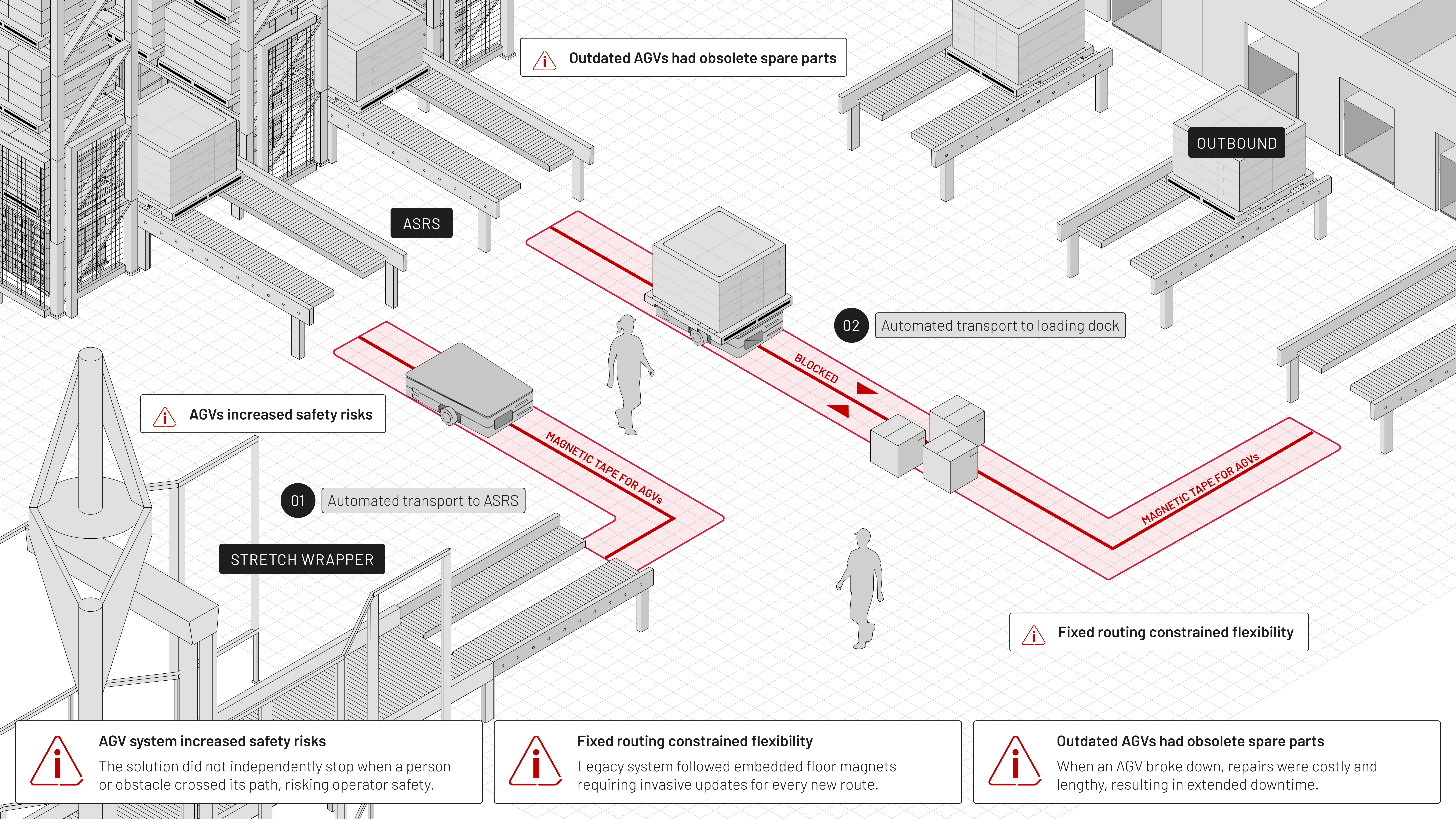 The aging system also created operational challenges. The AGVs relied on magnetic tape embedded in the floor, which made routes extremely rigid. Each time the facility needed to modify or expand a route, the magnets had to be removed and replaced—damaging the floor and causing costly downtime. At the same time, replacement parts for the outdated vehicles were increasingly difficult to source, leading to extended outages whenever a robot required repair.
